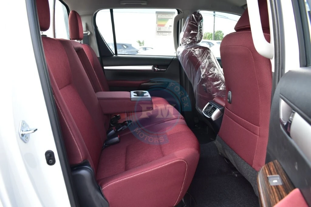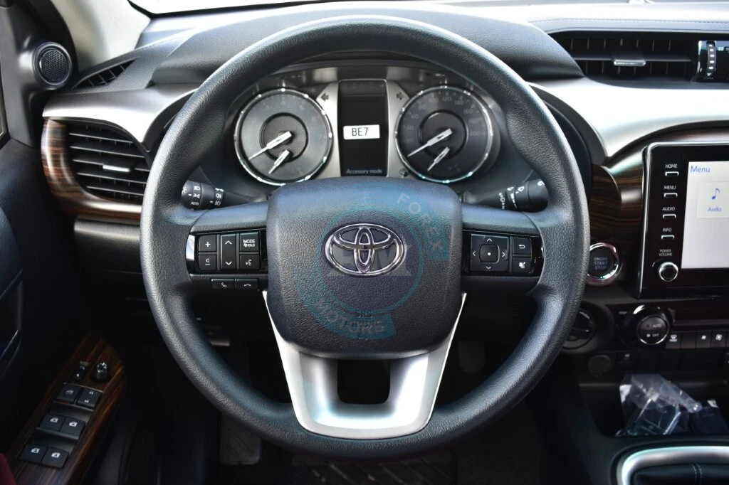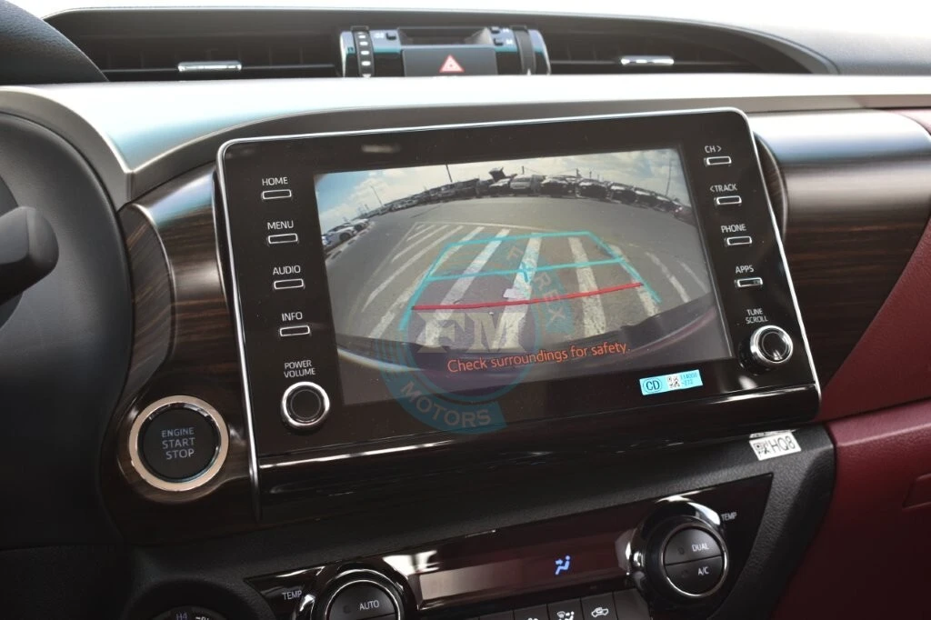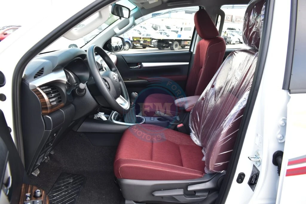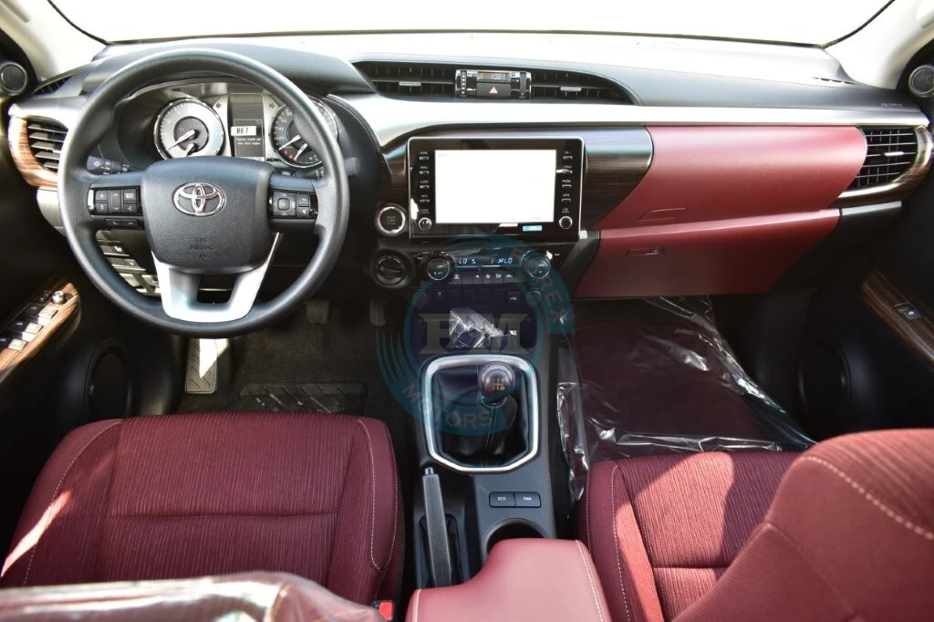 The exterior of the Hilux GLXS-V Manual presents a refined and purposeful design with LED projector headlamps, LED daytime running lights, sequential turn signals, chrome accents on the grille and exterior trim, body-colored bumpers, a sports bar, and 17-inch alloy wheels that complement its capable and refined aesthetic. The well-appointed interior features fabric and synthetic leather upholstery, an eight-way power-adjustable driver’s seat, single-zone automatic climate control, an 8-inch touchscreen infotainment system with Apple CarPlay and Android Auto, a standard audio system, and essential storage solutions throughout the cabin. Safety features include dual front airbags, side airbags, curtain airbags, ABS with Electronic Brakeforce Distribution, brake assist, vehicle stability control, a rear camera, rear parking sensors, and hill-start assist control for comprehensive occupant protection and confident maneuvering assistance.