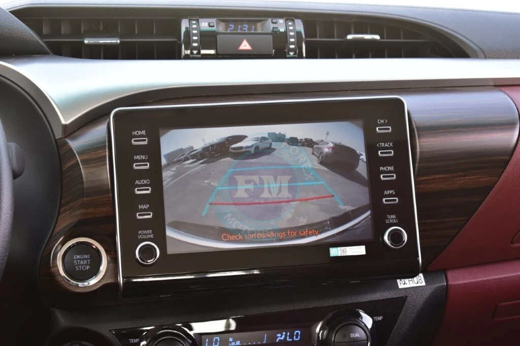The exterior of the Hilux VX V6 showcases a commanding and sophisticated design with full LED headlamps, LED daytime running lights, sequential turn signals, chrome accents on the grille and exterior trim, a power-operated rear tailgate, illuminated door sill plates, a sports bar, roof rails, and 18-inch alloy wheels that reinforce its premium and commanding visual presence. The well-appointed interior features premium leather upholstery, heated and ventilated front seats, a heated steering wheel, dual-zone automatic climate control, a 12.3-inch touchscreen infotainment system with Apple CarPlay and Android Auto, a premium JBL audio system, a digital rearview mirror, and a colored head-up display. Safety features include the Toyota Safety Sense suite with pre-collision warning, automatic emergency braking, adaptive cruise control, lane departure alert, lane tracing assist, blind spot monitoring, rear cross-traffic alert, a 360-degree panoramic view monitor, rear parking sensors, and multiple airbags for comprehensive occupant protection