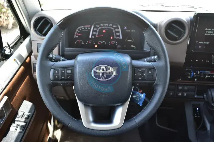 The 2025 Toyota Land Cruiser 71 Hardtop SDLX 2.8L Diesel 4WD 5-Seater Automatic Transmission – EURO5 is the ultimate blend of rugged utility and refined comfort, purpose-built for serious off-roaders who don’t want to compromise on interior quality. On the exterior, this iconic 4×4 comes equipped with robust 16-inch alloy wheels wrapped in 265/70R16 tires, a spare wheel cover, and a tough front black bumper. Its go-anywhere capabilities are enhanced with an electrical winch, over fenders, and a full suite of advanced lighting, including LED headlamps, LED DRLs, LED front fog lamps, and headlamp leveling for optimal visibility. Inside the cabin, comfort meets functionality with leather seats, manual air conditioning, and a clean layout centered around a wood grain-effect dashboard. The leather-wrapped steering wheel with wood trim adds a touch of sophistication. Practicality is not forgotten with front cup holders, a center console, 2 USB-C charging ports, and carpet floor mats. The LED cabin lamp provides excellent interior illumination, perfect for both urban drives and remote adventures. This model stands out with its Euro 5 emissions compliance and is tailored for markets requiring advanced diesel technology, delivering a perfect balance of legendary durability and modern convenience.